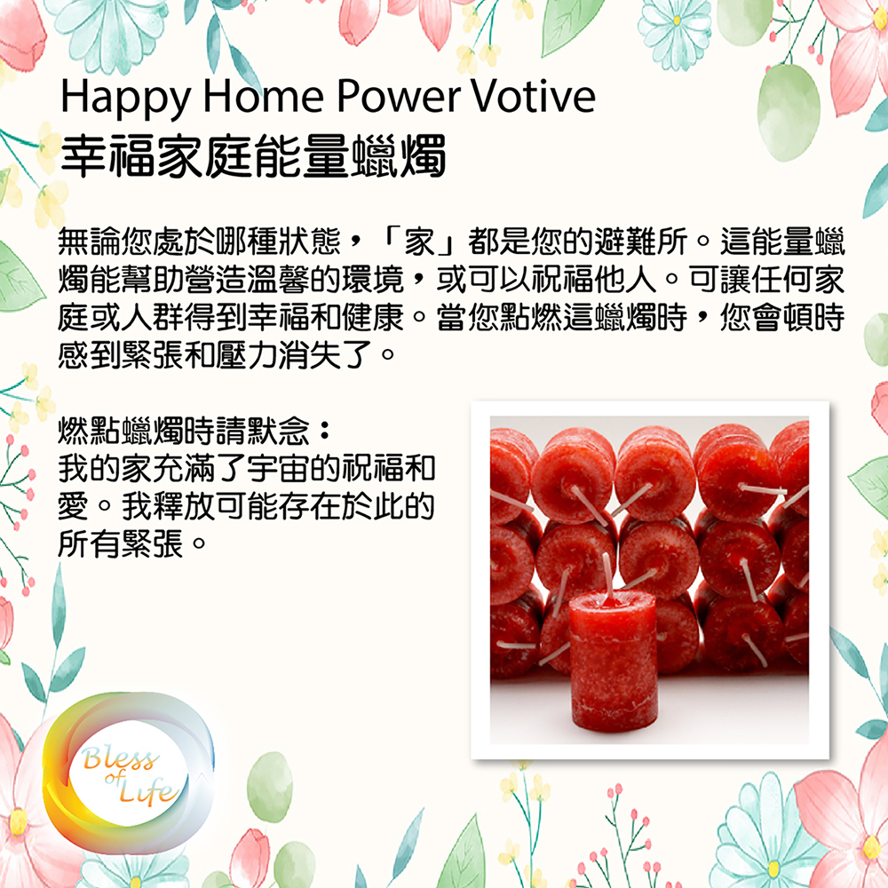 無論您處於哪種狀態,「家」都是您的避難所。這能量蠟燭能幫助營造溫馨的環境,或可以祝福他人。可讓任何家庭或人群得到幸福和健康。當您點燃這蠟燭時 ,您會頓時感到緊張和壓力消失了。