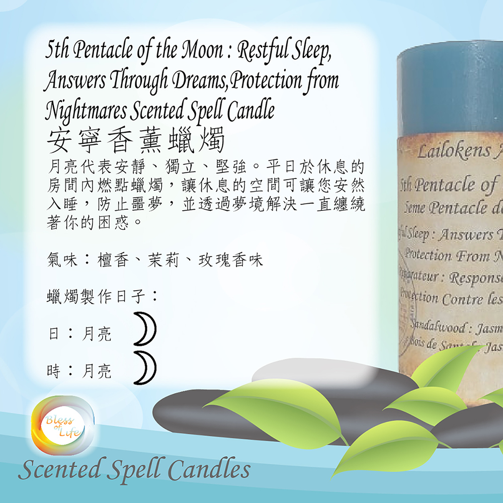 月亮代表安靜、獨立、堅強。平日於休息的房間內燃點蠟燭,讓休息的空間可讓您安然入睡,防止噩夢,並透過夢境解決一直纏繞著你的困惑。