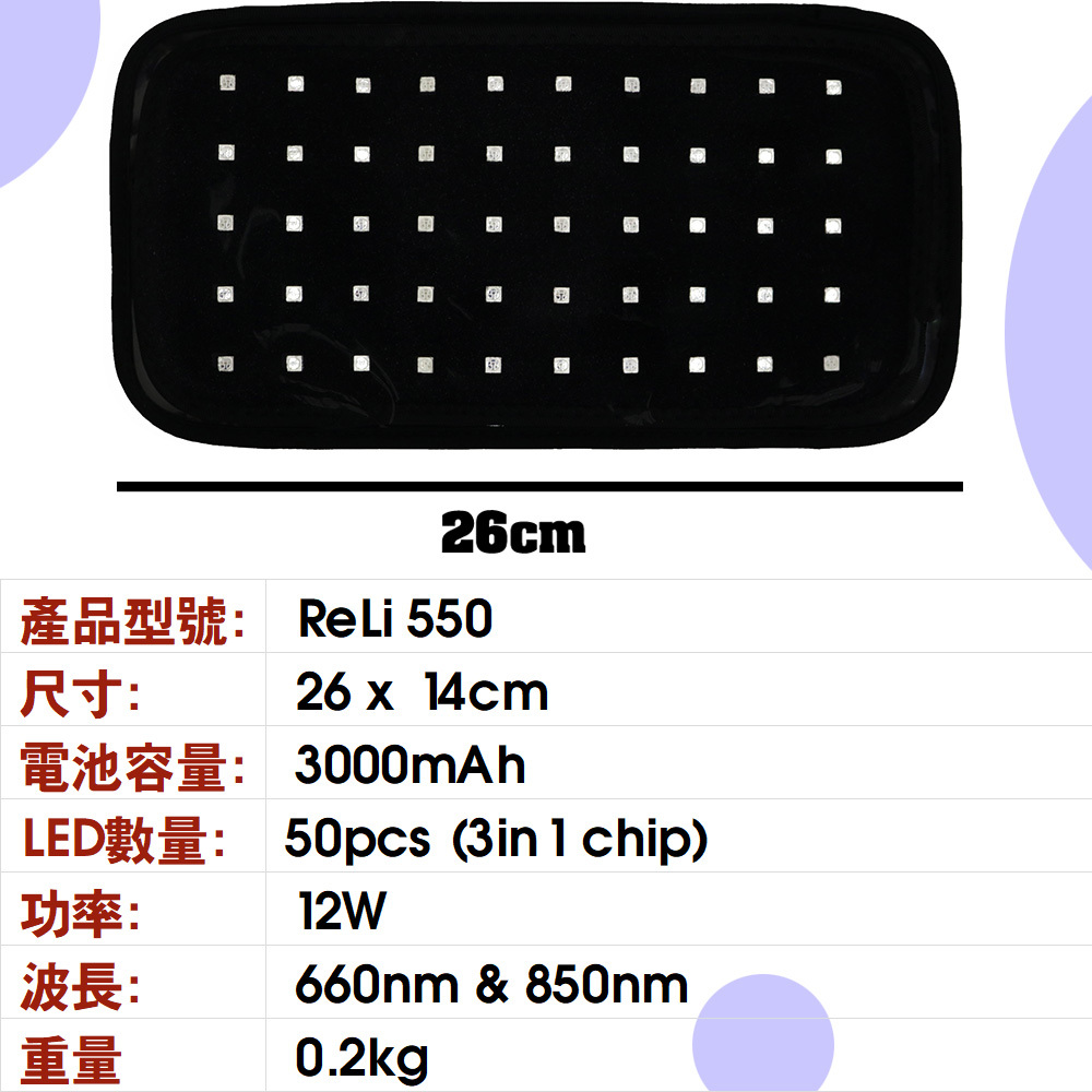 ReLi 550 充電式無線 紅光‧近紅外線LED墊功能強大,可提供 660nm 和 850nm 兩種不同波長,這些都是自然陽光中的波長,在許多研究中已經證明對人體有很好的益處。